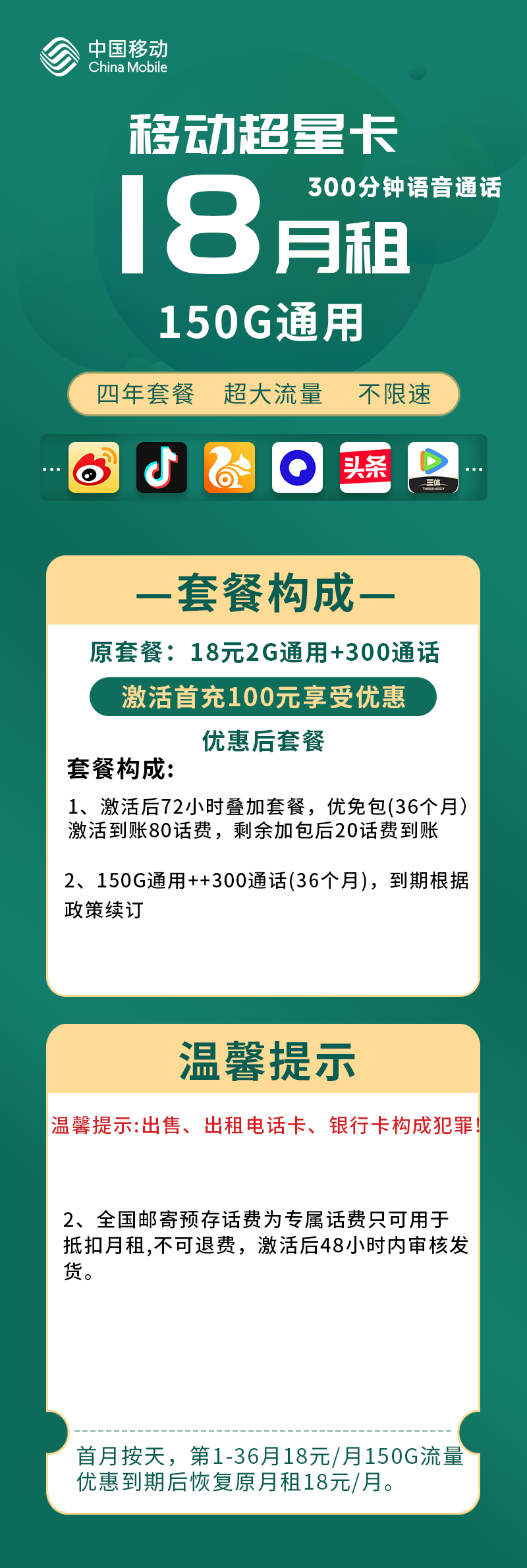 移动超星卡(三照开卡)18元150G全国通用+300语音通话(全国发货,超低月租,三年套餐)(全国发货,超低月租,三年套餐)